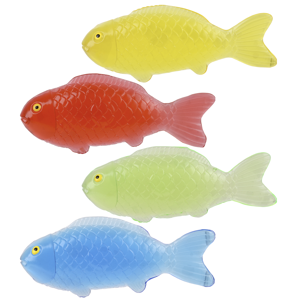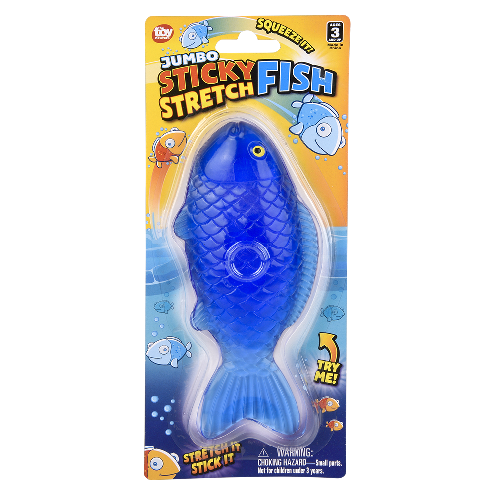 Stretch this Jumbo Sticky Stretch Fish! Great sensory toy. Assorted colors. Sold by the dozen. Each piece on a blister card.
