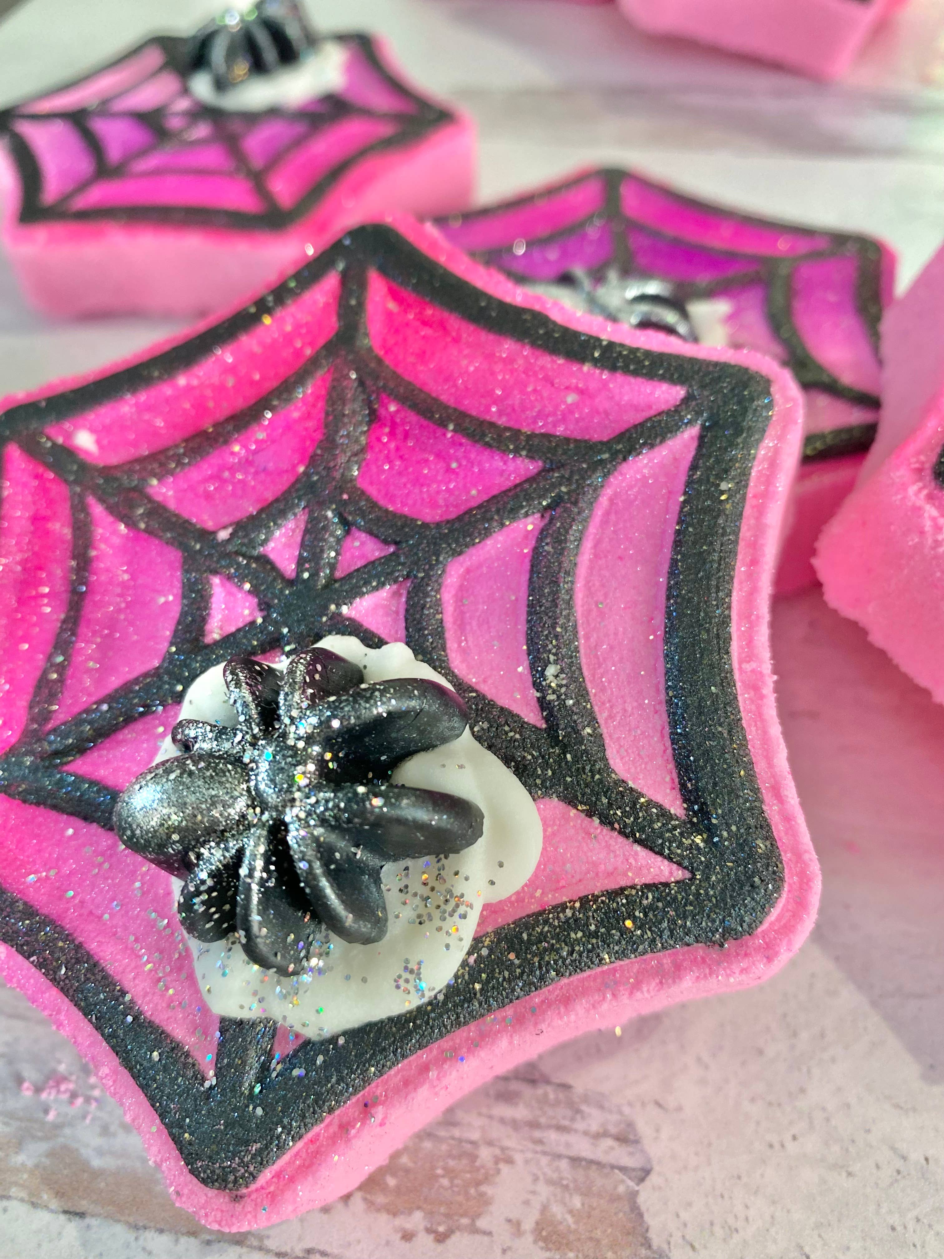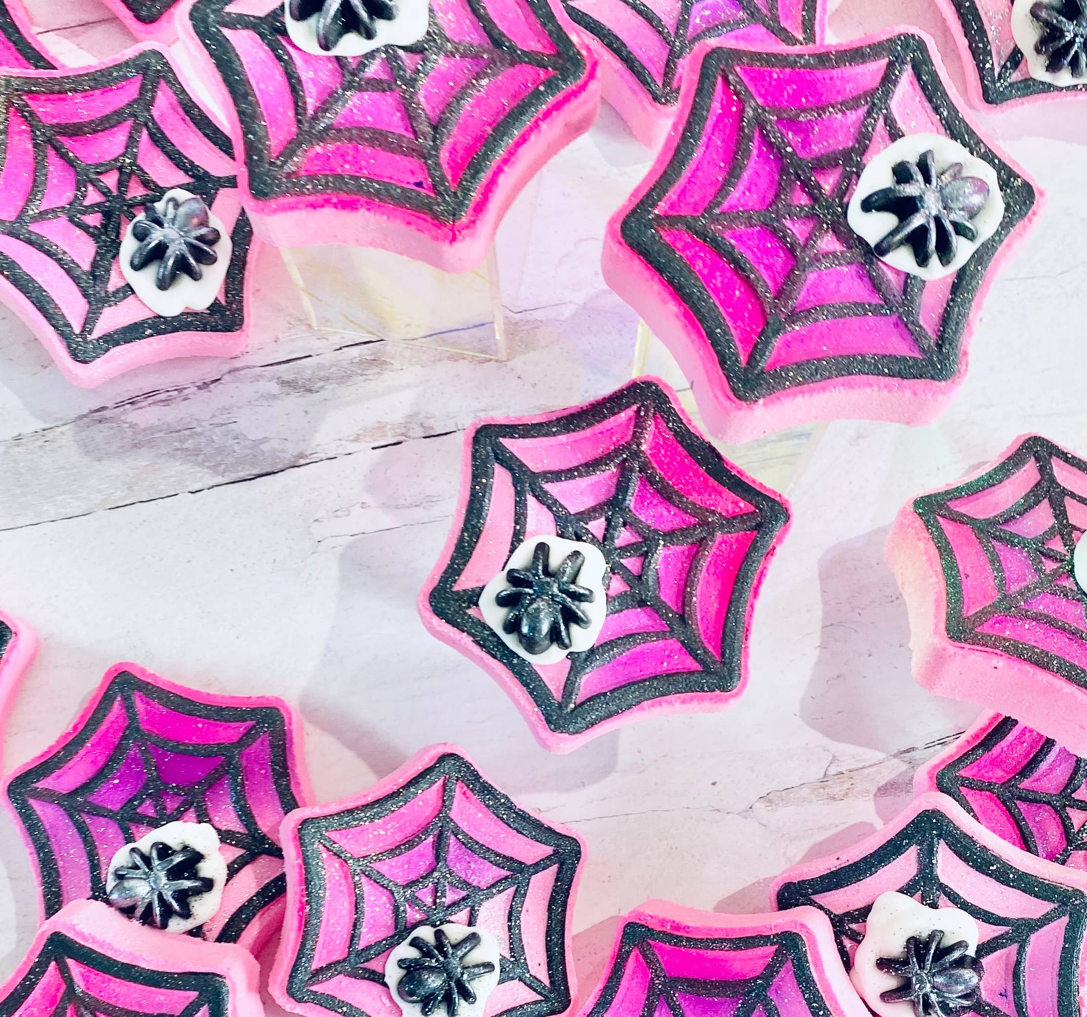 Unleash a spooktacular bathing experience with our Spinderella Bath Bomb, complete with a creepy-crawly surprise! Each bath bomb is handcrafted with care, featuring a unique spider web design and topped with a mini spider soap. As the bath bomb dissolves, it releases nourishing ingredients and enchanting scents. This bath bomb has a sweet pink scent infused with cherry, almond, tonka, and wild orange. We hand fill, press, paint, and package each bath bomb for your order. ALL bath bombs come shrink wrapped and labeled with ingredients. We wrap and secure your bath bombs with bubble wrap and packing peanuts to ensure a safe trip.