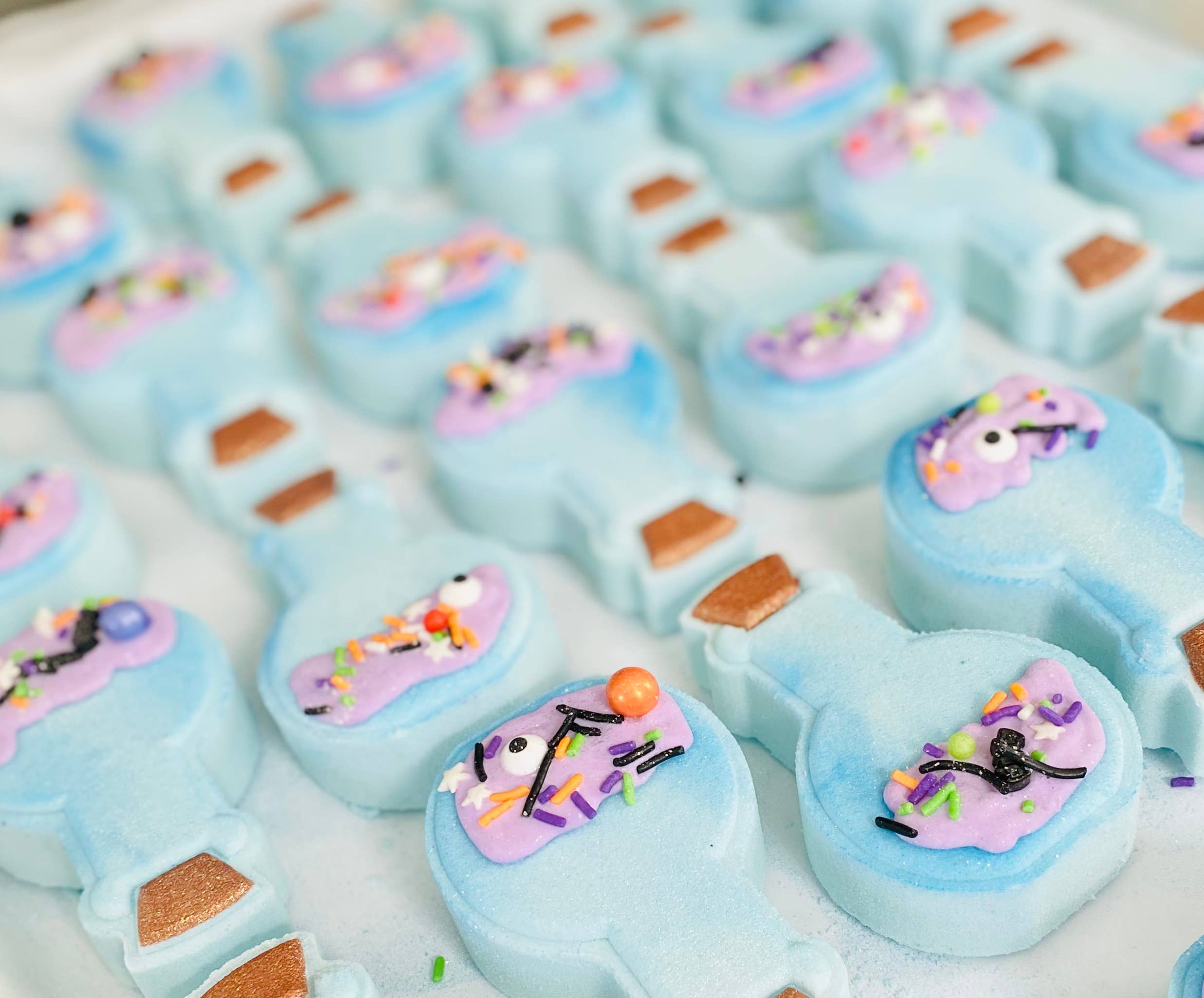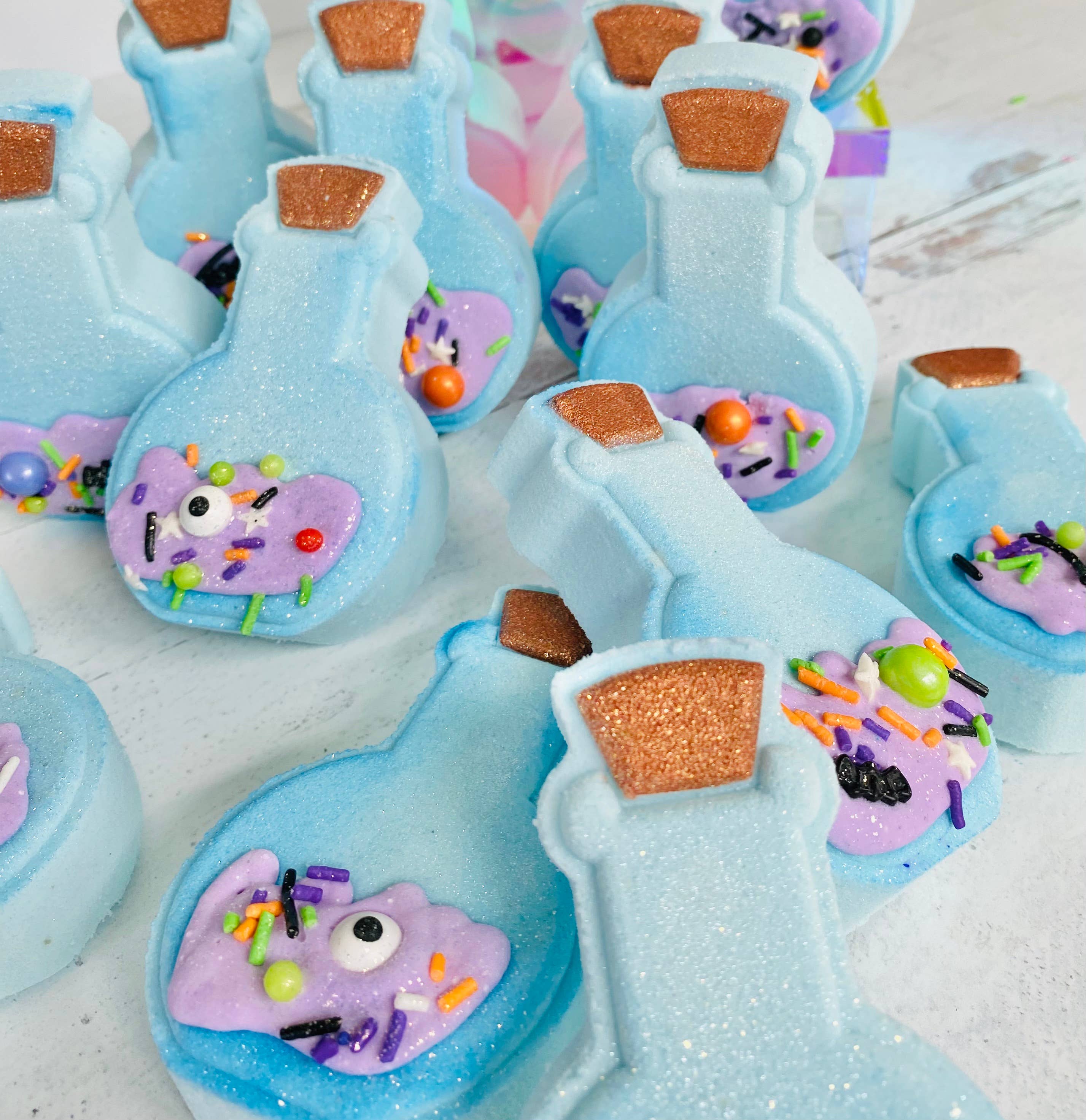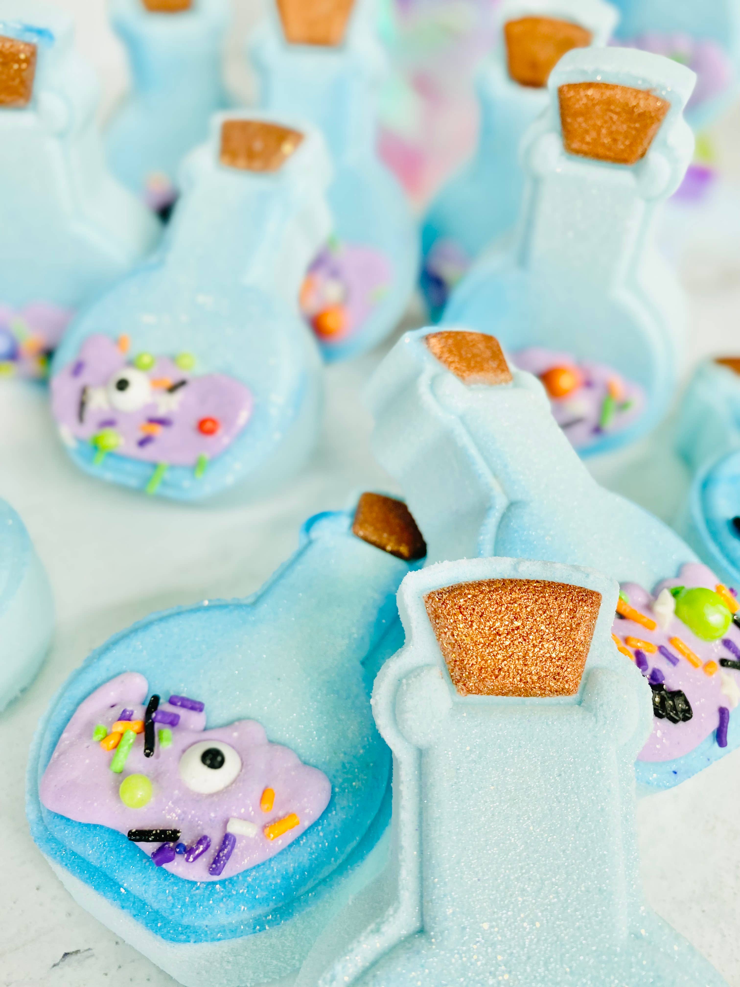 Our cute potion bottles are handcrafted for Halloween fun. Scented in notes of citrus, apricot, mixed berries, blossoms, and warm vanilla. Each bath bomb includes bubble frosting, and colorful embeds that disperse in water. Your order is freshly made to ensure the highest quality. We hand fill, press, paint, and package each bath bomb for your order. ALL bath bombs come shrink wrapped and labeled with ingredients on labels. Ingredients: Baking Soda, Citric Acid, Cream of Tartar, SLSA, Fragrance Oil, Kaolin Clay, Poly 80, FD&C Approved Dye, Mica, Sweet Almond Oil, Soy Bean Oil, Sprinkles. Bath Bombs may have minor surface cracks or imperfections. We wrap and secure your bath bombs with bubble wrap and packing peanuts to ensure a safe trip. If you have damages please reach out and let us know.