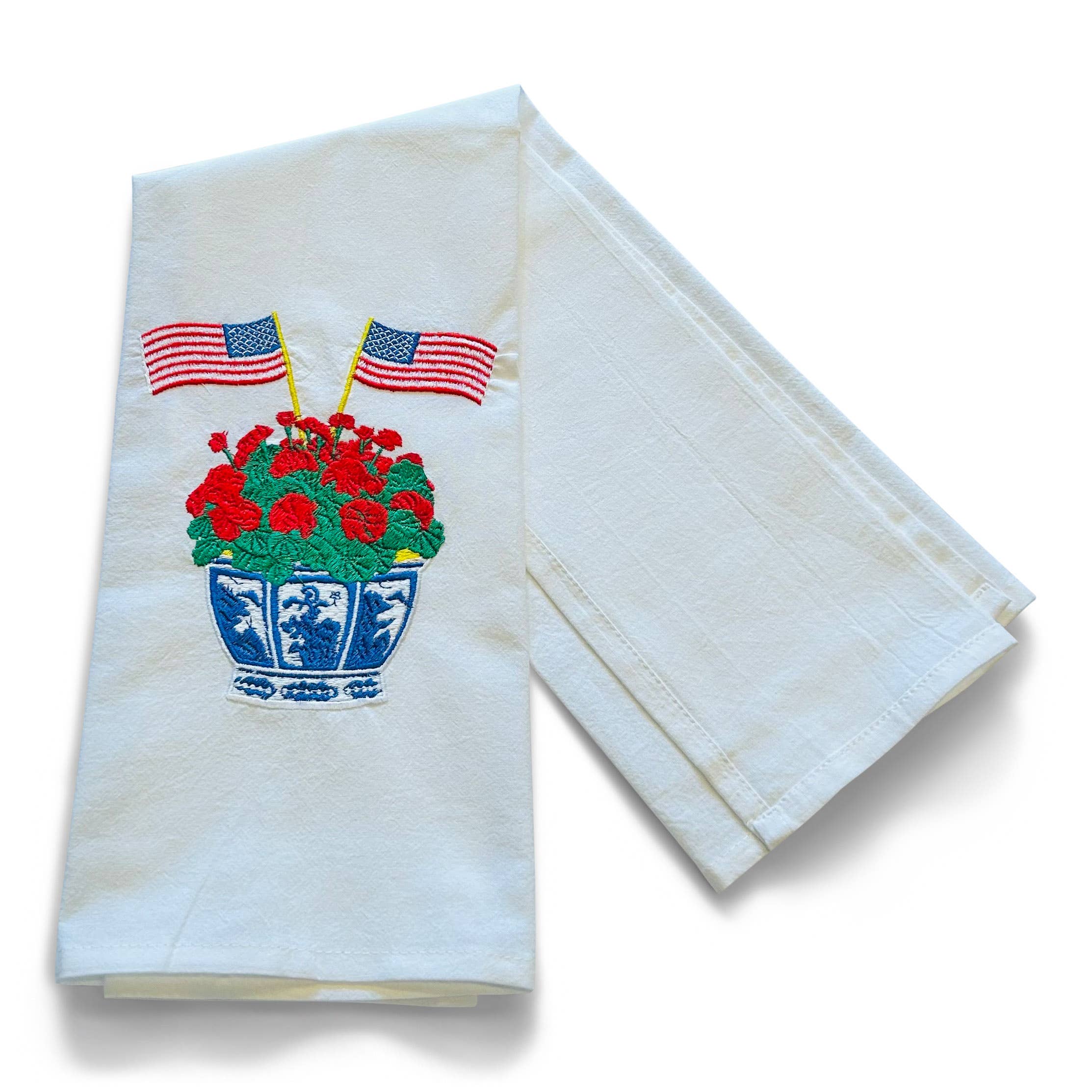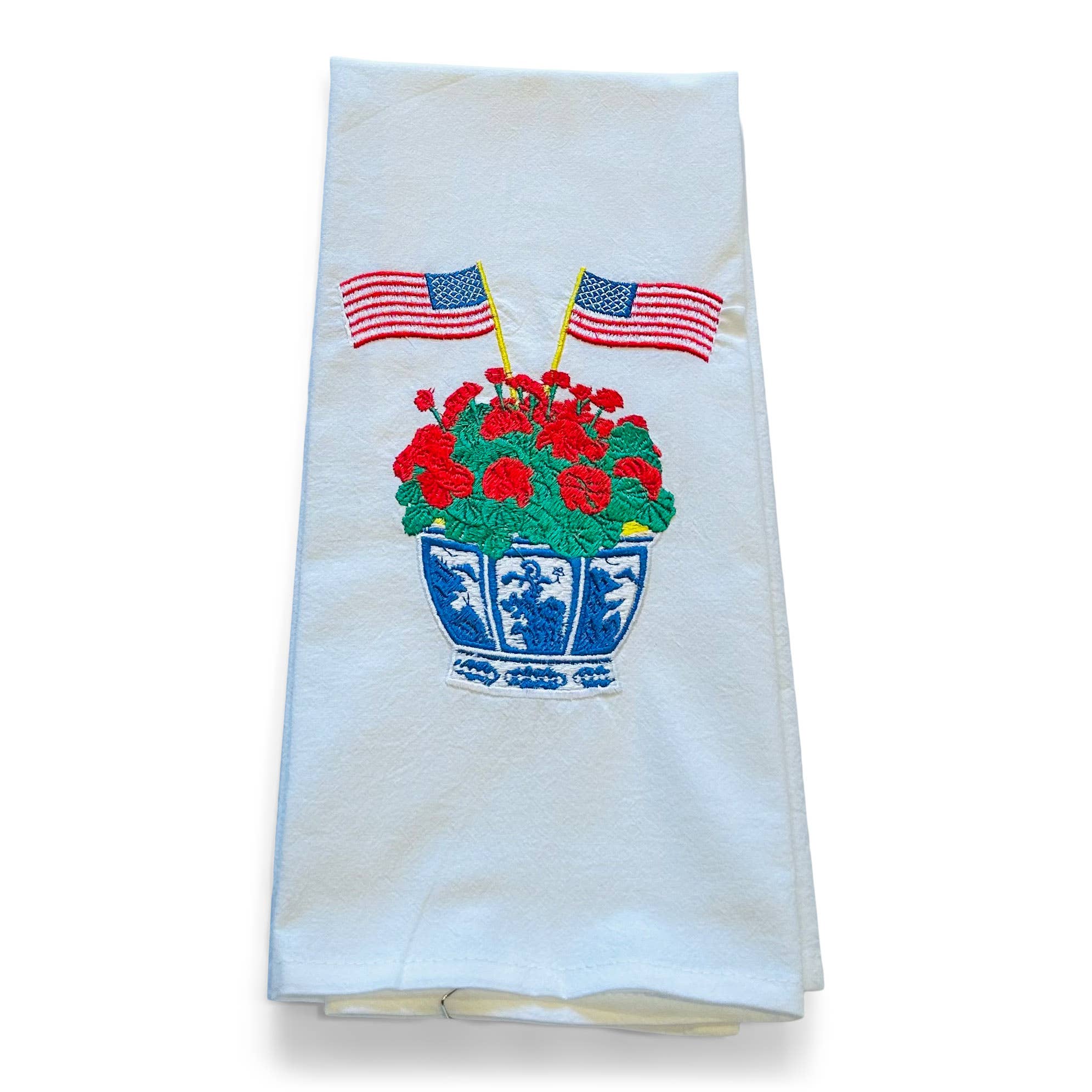 Vibrantly Blue - Towel - Geranium in Planter with American Flags on white